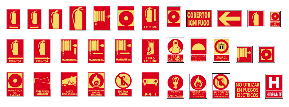 Nuestras señales se adaptan por su variedad a las necesidades de nuestros clientes (Protección contra incendios (color rojo), Vías de evacuación (color verde), Advertencia (color amarillo), Obligación (color azul), etc …)